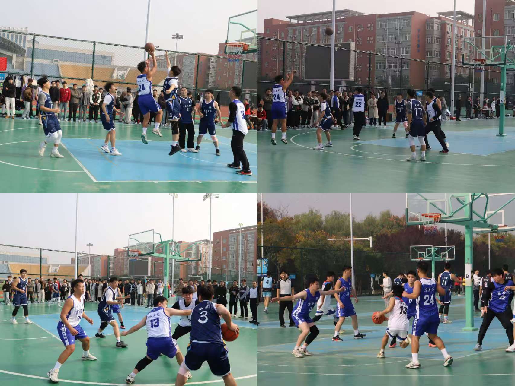 赛场上,球员们一路披荆斩棘,展现了卓越的竞技水平和强大的凝聚力。看那关键的抢断、精准的传球、坚决的突破,每一次攻防转换都扣人心弦。无论是身着蓝白战袍的商学院队员,还是其他学院的强劲对手,大家都秉持着“友谊第一,比赛第二”的精神,在球场上尽情挥洒青春。那一次次高高跃起的投篮,是力与美的结合,更是平时刻苦训练成果的集中展现。场边观众的呐喊助威,也化作了球员们奋勇向前的无限动力。背景中“迎‘篮’而上,‘研’途闪耀”的横幅,正是他们赛场征程的最佳注脚。
