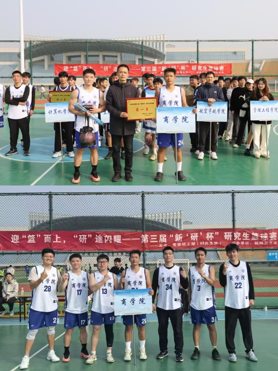 秋意正浓,热血沸腾。近日,郑州航空工业管理学院第三届“新研杯”研究生篮球赛圆满落幕。由我院学子麻文军(24号)、刘博浩(34号)、徐子尧(13号)、杨炯(17号)、谢锦锐(22号)、常耀璞(3号)、陈衍森(28号)、王彤(9号)等队员共同组成的商学院研究生篮球队,凭借出色的团队协作和顽强的拼搏精神,在十二个参赛学院中脱颖而出,成功夺得赛事总冠军!