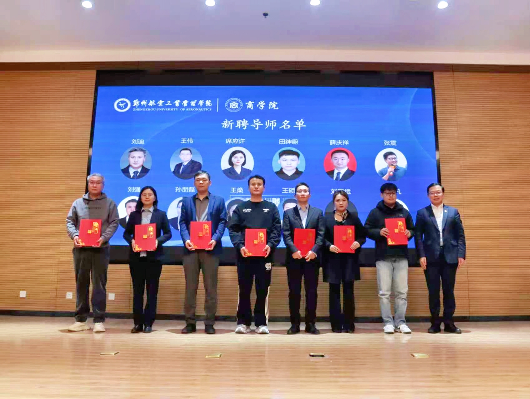 院长闫俊周宣读商学院第三批职业发展导师聘任决定,副校长程骄杰为新聘任导师代表颁发聘书。河南尚合教育在线科技有限公司教学教研主管刘迪、河南中投国控集团有限公司运营总监席应许、北京中名国成会计师事务所(特殊普通合伙)合伙人田绅蔚、河南斯坦德环境科技有限公司总经理刘强、北京市盈科律师事务所律师孙朋磊、星联智慧生活集团副总经理王燊和郑州知行航空科技有限公司负责人陆一凡作为新聘任导师代表上台接受聘书并合影留念。