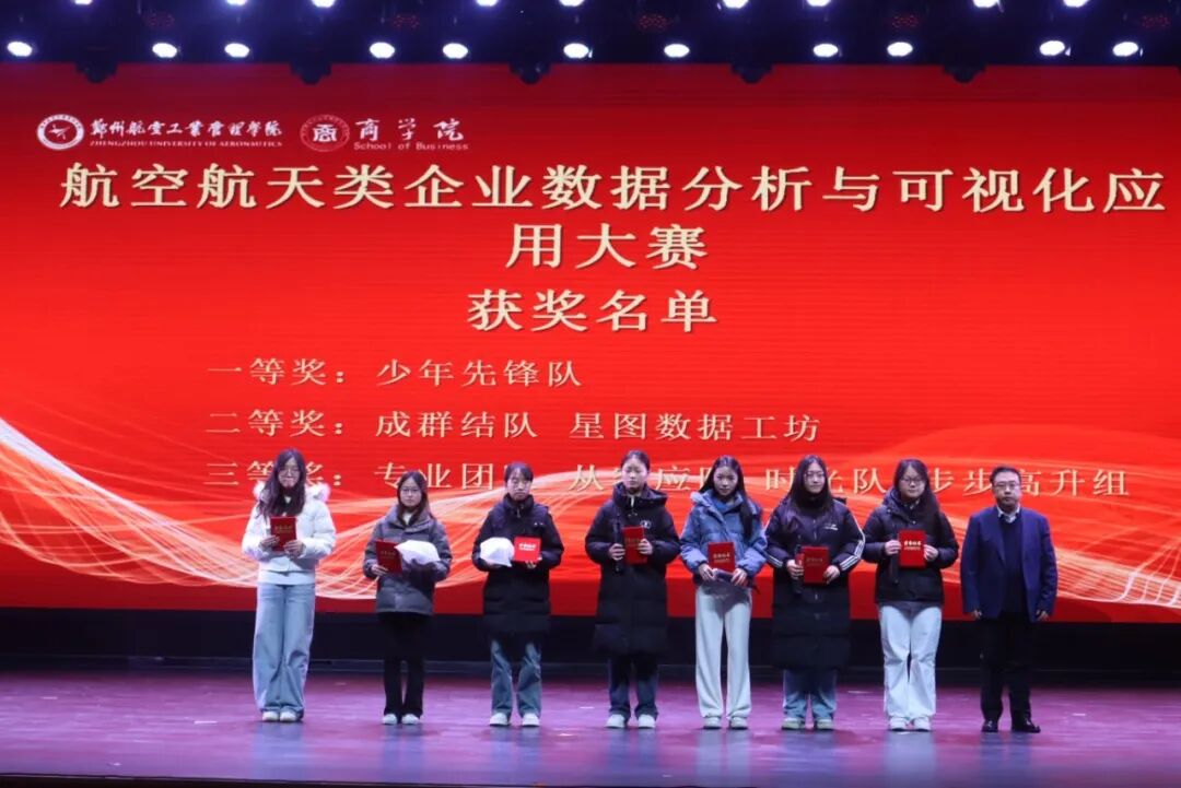 副院长周雪峰为航空航天类企业数据分析与可视化应用大赛、航空财经综合知识与技能竞赛获奖者颁奖并合影留念。
