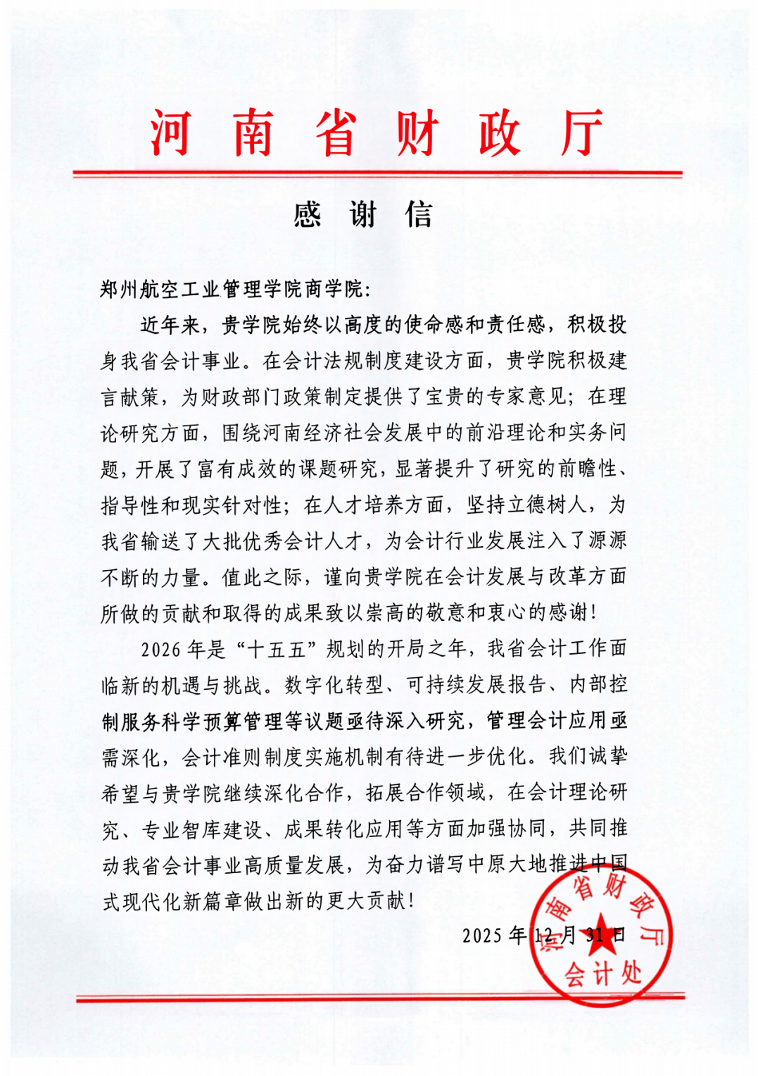 近日,河南省财政厅会计处发来感谢信,对我院在会计法规制度建设、理论研究和人才培养等方面的贡献予以高度认可。这体现了我院长期以来在服务河南省经济社会发展方面的积极作为。感谢信全文如下: