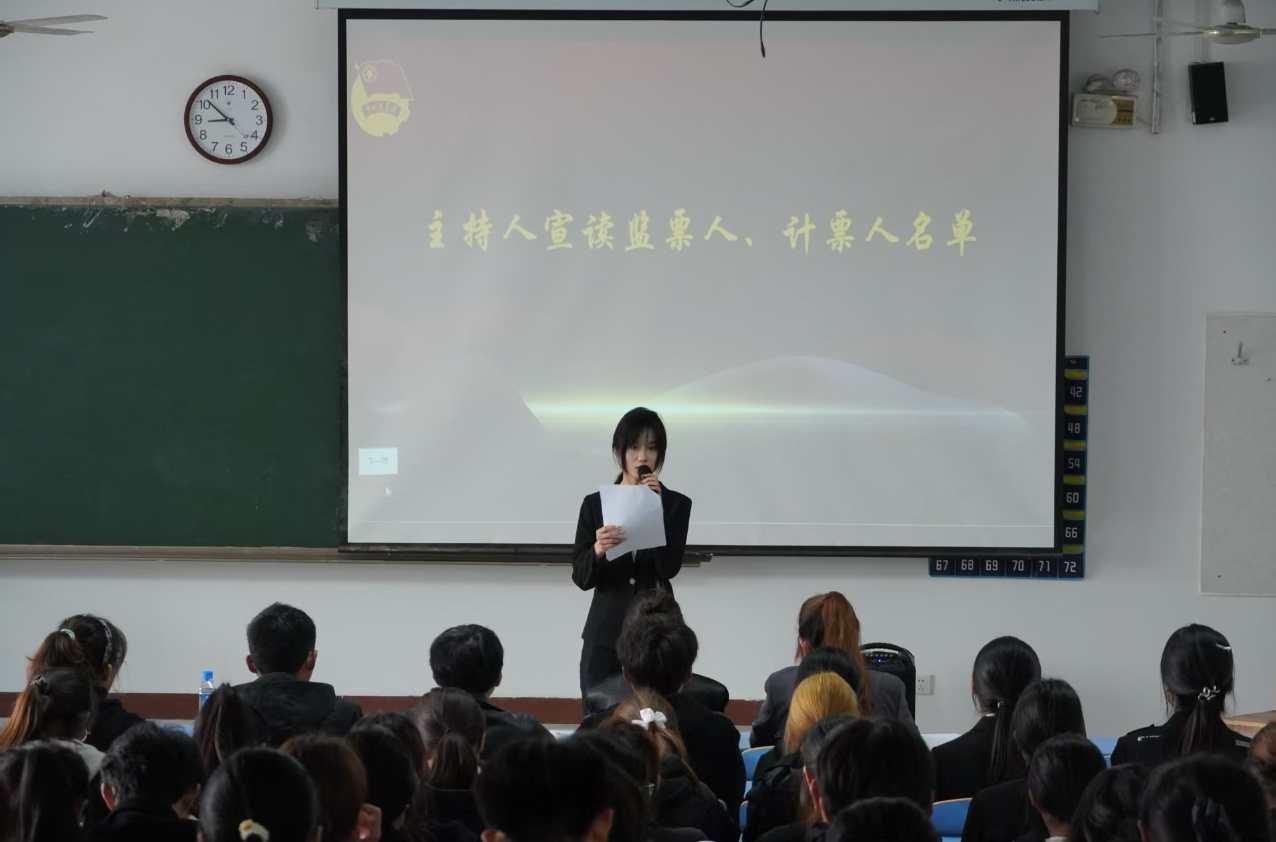 投票环节中,主持人依次介绍分团委候选人与青年志愿者团成员。参会代表以匿名投票的方式对候选人进行投票。最后,总计票人宣读候选人票数,总监票人公布候选结果:第七届团代会选举产生了符运丽等77名委员。