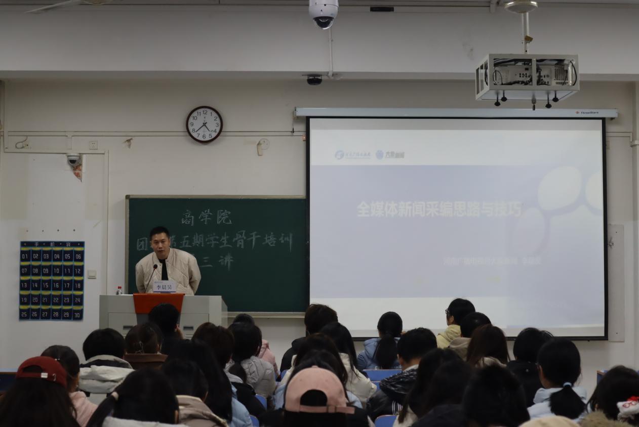 为推动我院团学工作提质增效,助力学生骨干培训提升业务素质和工作能力,12月4日,我院团校第五期学生骨干培训第三讲在01C206教室成功举办。本次活动特邀河南广播电视台大象新闻一线记者李晨昊担任主讲嘉宾,学生骨干代表70余人参加培训。