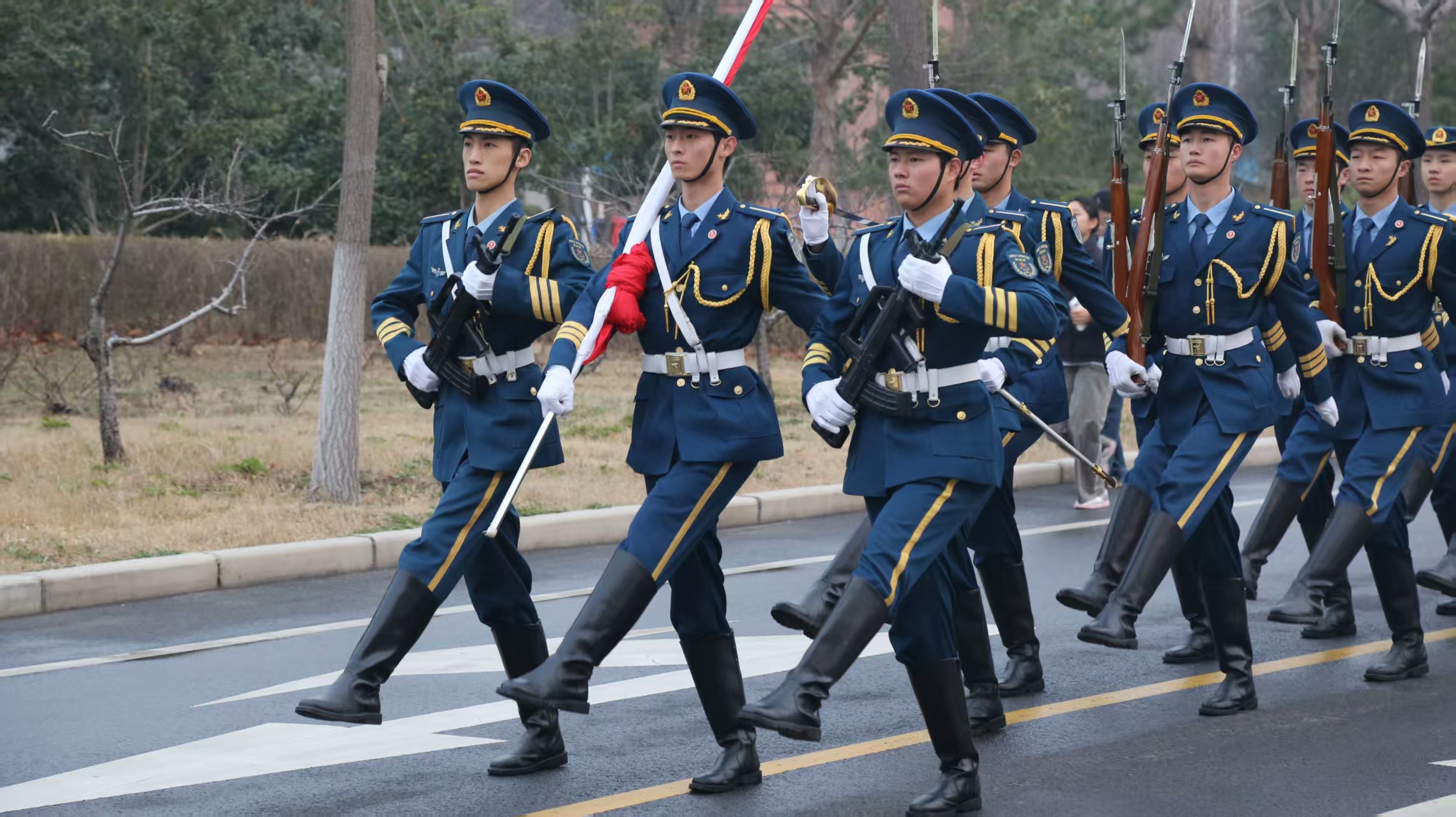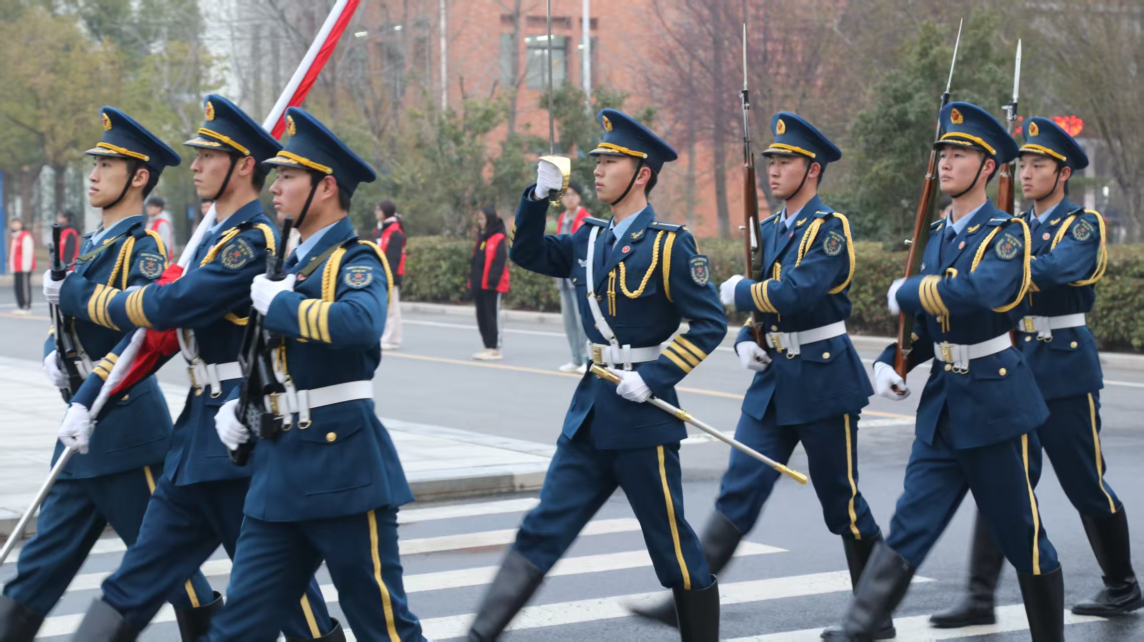旭日东升,晨光中,国旗仪仗队队员迈着铿锵有力的正步走向旗杆,步伐整齐划一,气势如虹。国歌奏响,五星红旗冉冉升起,迎风飘扬。全体师生肃立注目,满怀对祖国的崇高敬意与真挚热爱,现场庄重肃穆。